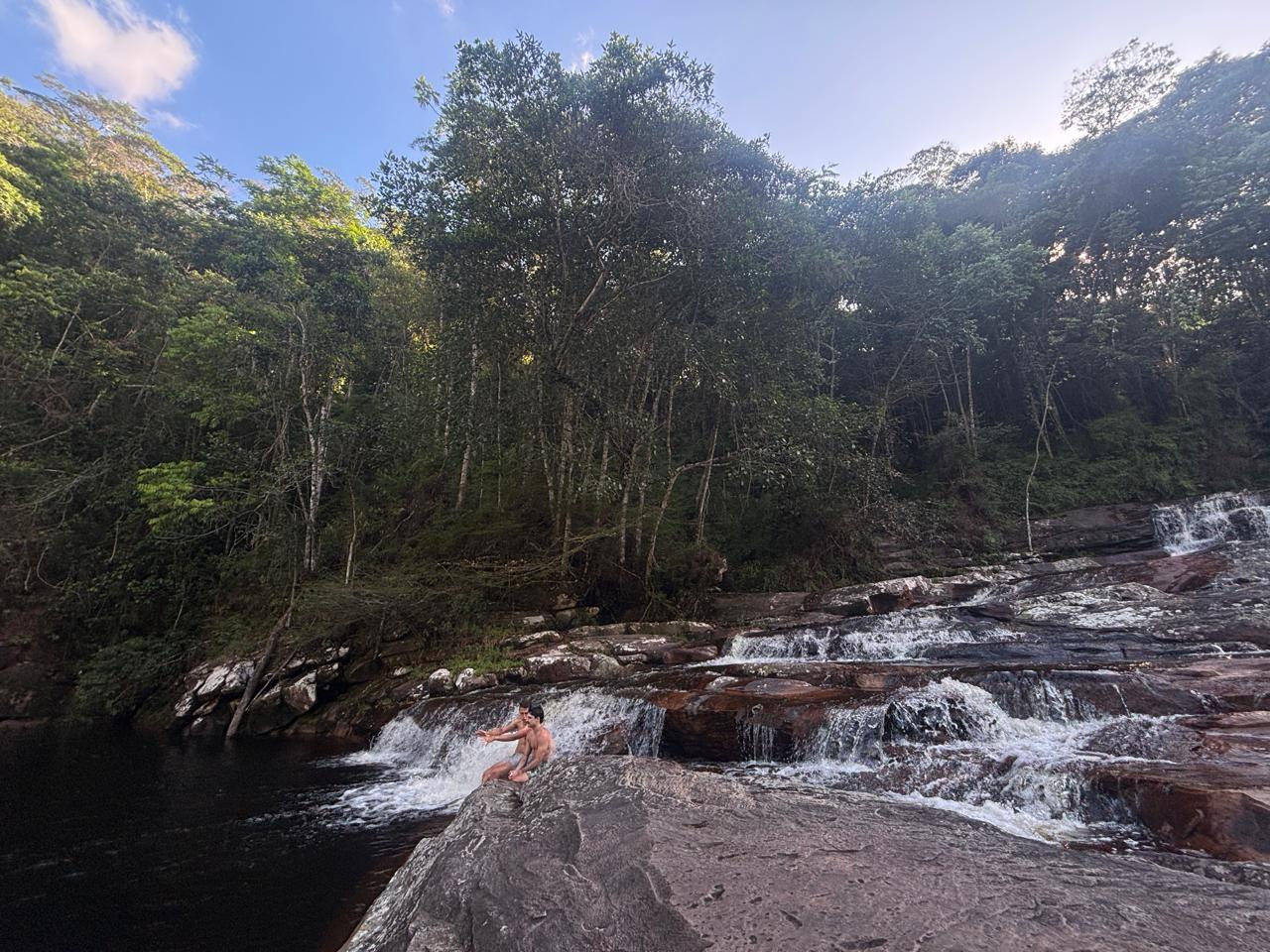 À medida que avançamos, os paredões de pedra começam a se erguer verticalmente, atingindo alturas impressionantes. O silêncio do cânion é interrompido apenas pelo som da água, no trajeto, passamos também pela cachoiera do Encontro, perfeita para uma pausa, um banho e um cafezinho.